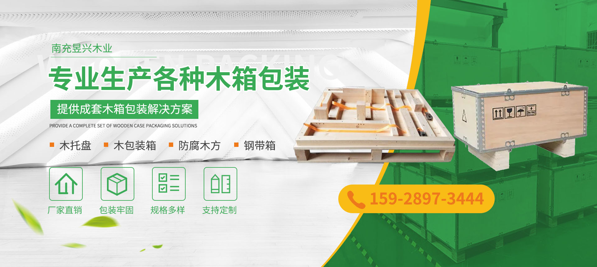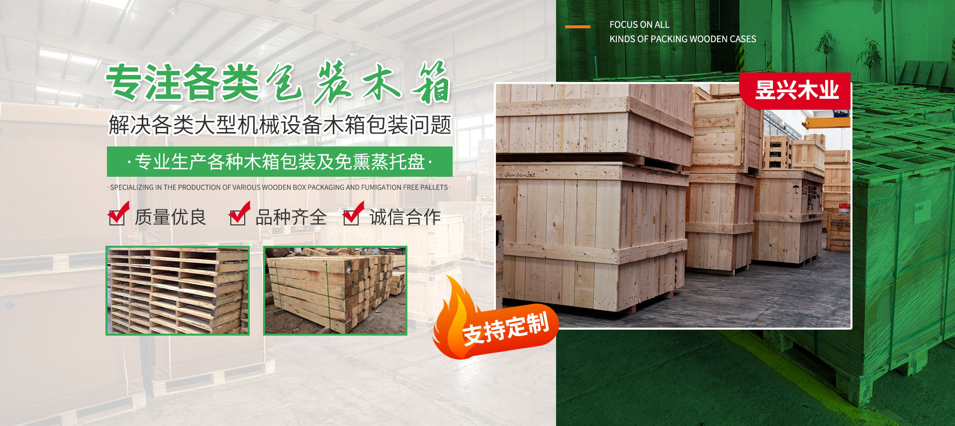昱興木業集加工、包裝、銷售為一體的大型木箱企業,專業生產各種木箱包裝(出口木箱,熏蒸木箱,卡扣式木箱,可拆卸木箱,模具木箱,免熏蒸木箱,折疊木箱,鋼帶木箱,角鐵木箱,本廠制作的免熏蒸托盤及包裝箱。
